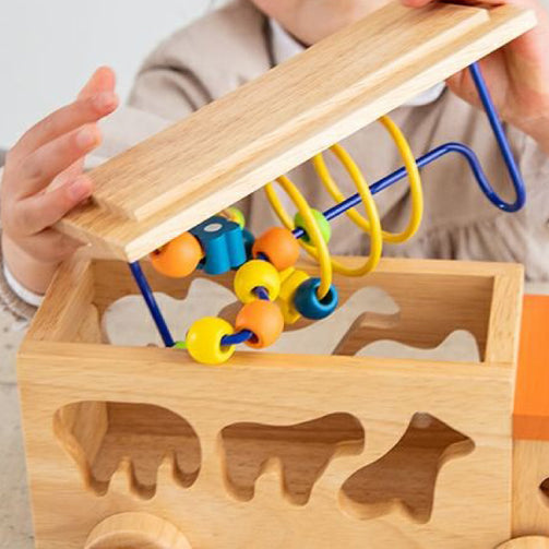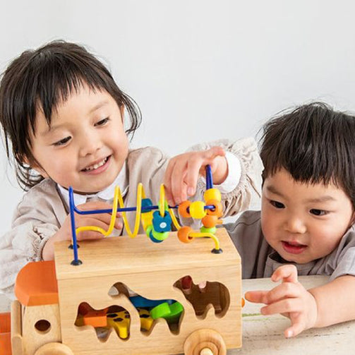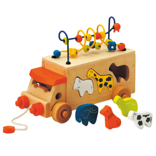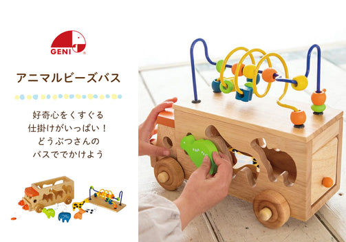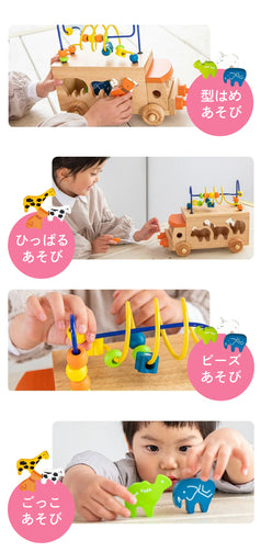 動物のかたはめパズルとビーズあそびができるよくばりプルトーイ。バスにはヤギ、キリン、カメ、イヌ、ウシ、ゾウの6匹の動物のシルエットがあり、形を認識しながらブロックをはめていきます。また、バスの上にビーズコースターをのせて、ビーズをクルクルと動かしたり、手先の器用性と集中力を養います。