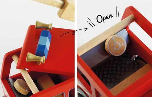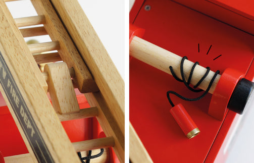伸縮・回転可能なはしごと、巻き取り式の消化ホースをもったはしご車です。荷台の後部と側面のドアは開閉可能。運転席の上部も外せるため、お気に入りのフィギュア等に運転させることも可能です。木製の火のパーツ付属で消火作業に臨場感をプラスできます。