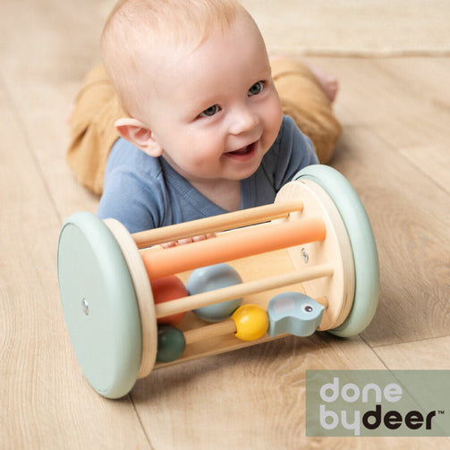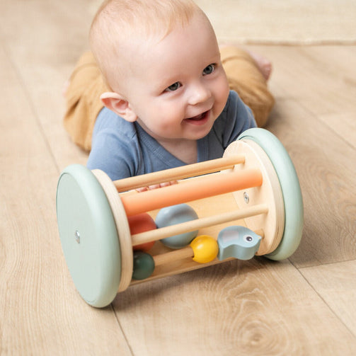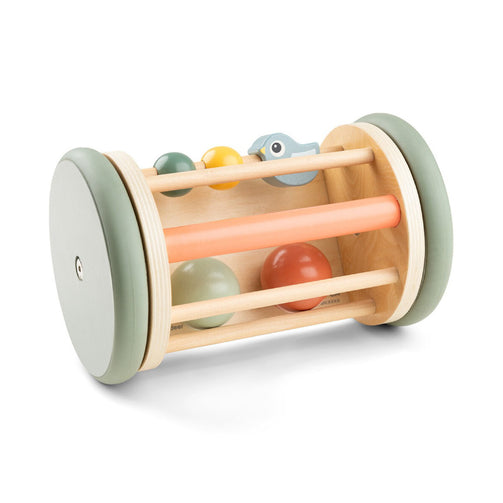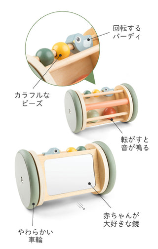 コロコロ転がる木のおもちゃ。突然大きな鏡に自分の顔が映って、赤ちゃんびっくり! 転がすたびに、中でカラカラ音を立てるボールが楽しく、また左右に動くバーディーと2つのビーズも動かせるので、たくさんの発見のあるトイです。 タイヤ部分はゴムのように柔らかいTPE製なので、転がしても床を傷つけにくいのもうれしいポイント。鏡はアクリル製なので割れにくく安心です。