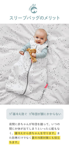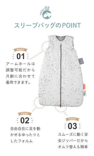 注意事項 | ※欧州規格:EN16781に準拠しております。 ※この商品は2.5tog(暖かさ目安)ですので、室温16-20℃の標準的な室内での使用をお勧めいたします。 ※お子様の頭が首の開口部から通過してしまう場合は使用しないでください。 ※首と腕の開口部が、しっかりと固定されていることを確認してください。 ※お子様がベッドから降りることができる場合は、ご使用はおやめください。 |