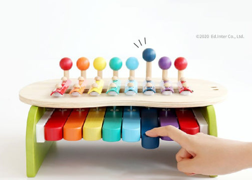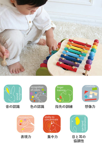 鍵盤を押すと、音と連動して丸いモチーフがぴょんぴょんと跳ねます。 音と動きが連動することで、相乗効果で大きな喜びを感じ、関係性に興味を持つきっかけになる商品です。 天板の上に鉄琴が出ているので、それをバチで叩いて遊ぶこともできます。 強弱などの指先の訓練、創造力、発想力、指の動きと位置を空間的に認識する力、メロディーを覚える力などを養う事ができます。