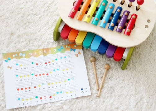音符の色を見ながらかんたんに演奏ができる「ちょうちょう」の楽譜付き。楽譜が読めない小さなお子様でも大丈夫!