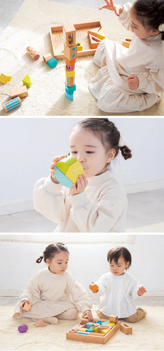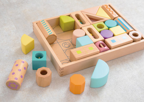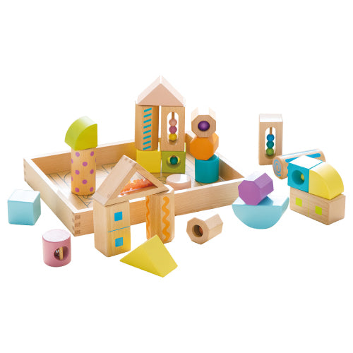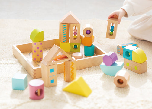 丸や三角・四角などたくさんの形や大きさの13種類41ピースのつみきセットです。天然の白木つみきと、振るとしゃかしゃか音がなる砂やビーズ、アクリルなどの素材のブロックも入ってるので、色や形・音や素材の違いを遊びながら感じることができます。また並べたり、積み重ねたり、くずしたりとつみきあそびを繰り返す中で集中力や全体のバランス感覚も身につきます。つみきを収納できる台車は、ヒモを引いて遊ぶこともできます。