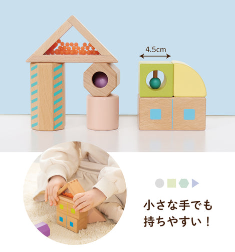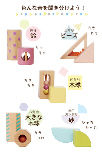 音の種類は全5種類。すべての積み木に音が鳴るしかけがあります。積み木の形状ごとに音が異なり、同じ形の仲間には同じ音のしかけが入ってます。
