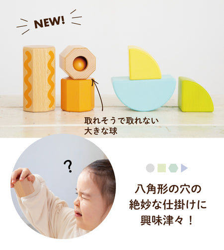 ボリュームセットに新たに仲間入りした、八角形、半円、おうぎ形のつみき。 新しい形が加わってさらに遊びの幅が広がります。