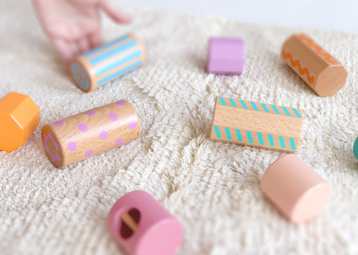 積み木を積むことができない時期は、転がして遊ぶ事もできます。転がっているときの音や模様など変化を目で見て楽しむ事ができます。