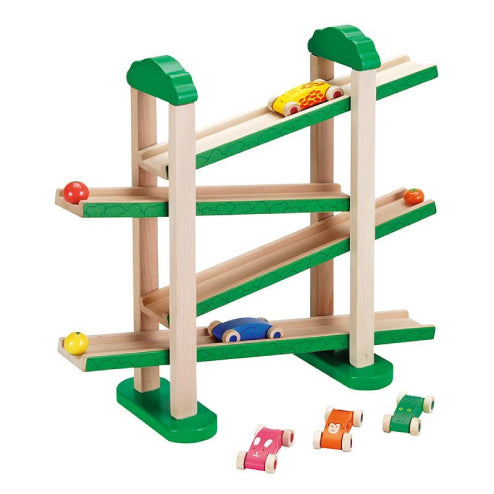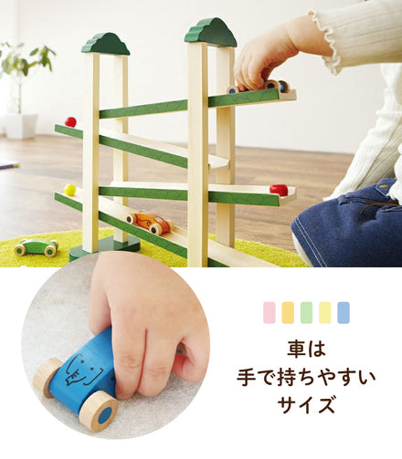 森のスロープを動物たちがジグザクに滑り降りていきます。 木製ならではの心地良い音がカタン、カタンと響きます。 飛び出し防止ストッパーはかわいいフルーツがモチーフになっています。車はお子さの手の持ちやすいサイズで動物の車だけでも遊べます。