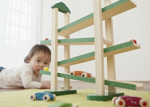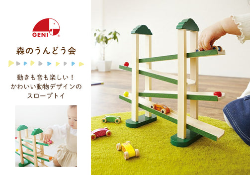 ぞう・きりん・さる・ワニ・うさぎの5つの動物たちが、森のスロープを運動会のようにジグザグに滑りおりていきます。木のおもちゃならではの心地よい音と動きが、子どもを惹きつけて五感を刺激します。動くものを目で追う追視能 力が自然と育まれ、「置く→転がる→落ちる」という単純な動きを繰り返す中で、集中力を育てます。