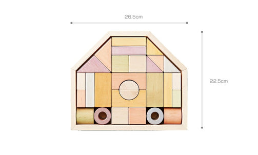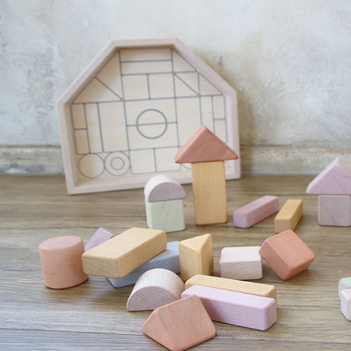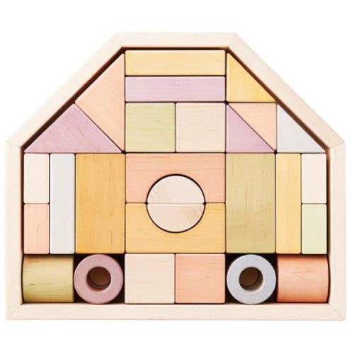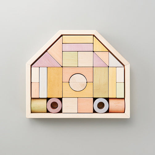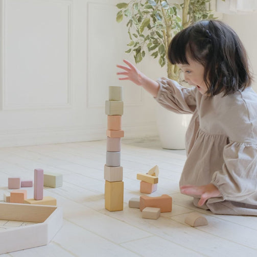 日本の職人によって日本産の上質な木材を使った積み木セット。シンプルなフォルムとやさしい色合いなのでお部屋に置くだけでもインテリアになります。