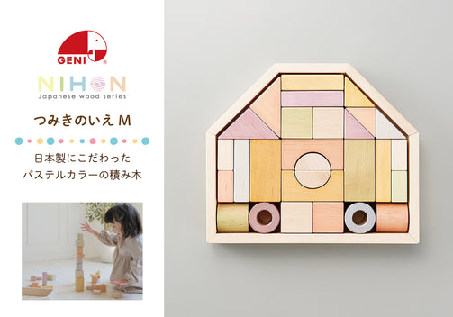 つみきのいえMは、基尺40mmで32ピースからなるつみきです。塗装されたつみきと白木のつみきがバランスよくセットされています。木箱が家の形をしており、あたたかみを演出します。親から子へ、そして子から子へ 「永く使える」「受け継ぐ」おもちゃ。日本の優れた職人によってひとつひとつ丁寧に削り取られた木材に、日本由来のやさしい色を再現した日本産木製玩具です。おもちゃ作りの原点に立ち帰り、本来あるべきおもちゃの良さ・価値を再確認しながらじっくりと仕上げたシリーズです。
