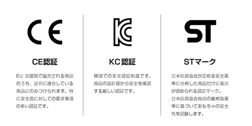 世界中のどんな子供たちにも安心して遊んでもらえるよう、製品の安全性を保証するCE認証、KC認証、STマークを取得しています。