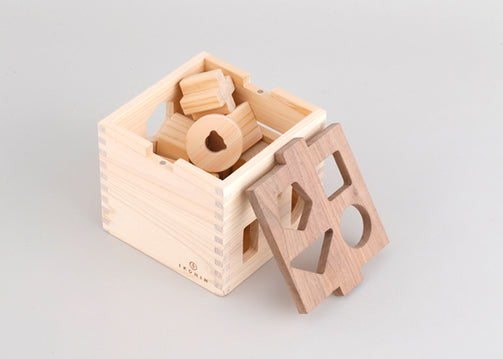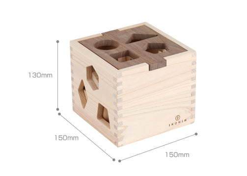 図形の認知能力、小さいブロックをつまむ指先の巧緻性、上手にはめることが出来た時の達成感など、様々な方面からの刺激を子供たちに与えます。形をはめるだけでなく、ブロックを積合わせて積み木としても遊ぶことができます。また、職人が一つずつ丁寧に『無塗装』で仕上げているため、安心してお使いいただけます。