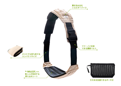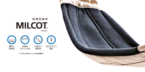 抱っこを安定させるため座面には、東レ「MILCOT」を採用しました。 東レ「MILCOT」は、独自の特殊構造組織の織り・編み素材で優れた防滑性とストレッチ性を兼ね備えた素材です。ライクラファイバーを高混率で使用することにより独特な風合いを表現しています。