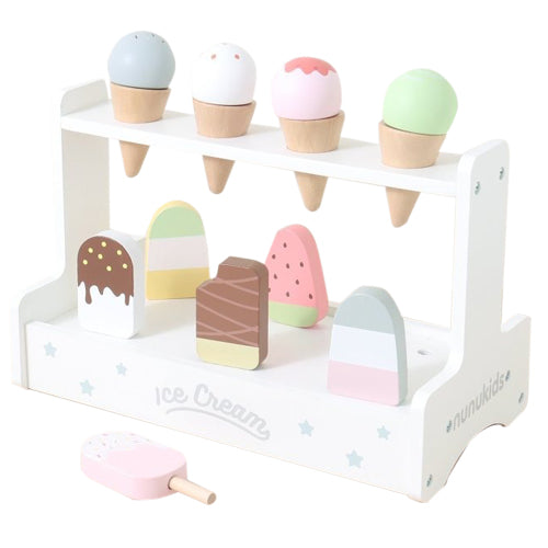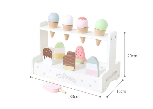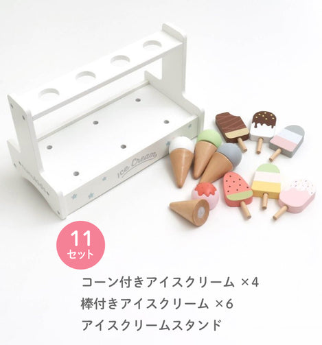 「美味しいアイスクリームはいかがですか?」木のぬくもりとくすみカラーが可愛い♪アイスクリーム屋さんごっこが楽しめるセットです。アイスクリームは全部で10種類♪コーン付きアイスクリームはマジックテープつきで、アイスとコーンが分かれます。写真映えもばっちりのとびきり可愛いアイテムです。ギフトにもおすすめです。