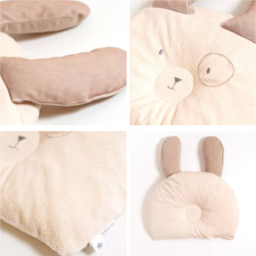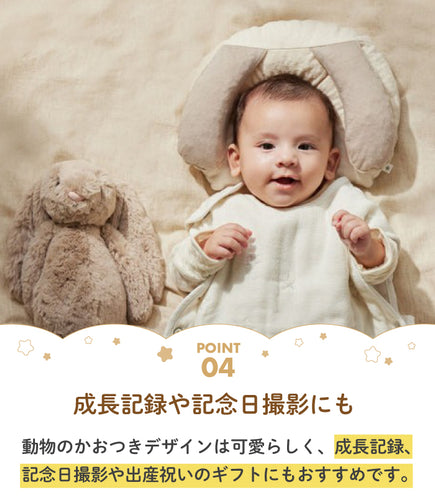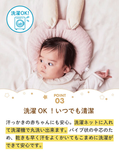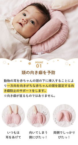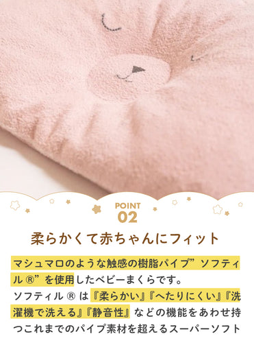 ベビーの向き癖を優しくケアするまくら。 マシュマロのような触感の樹脂パイプ”ソフティル?”を使用したベビーまくらです。 ソフティル?は『柔らかい』『へたりにくい』『洗濯機で洗える』『静音性』などの機 能をあわせ持つこれまでのパイプ素材を超えるスーパーソフトパイプ素材です。 動物の耳を赤ちゃんの頭の下に挿入することにより一方向を向きがちな赤ちゃんの頭を 固定する向き癖防止のサポートをします。※向き癖が直るものではありません。