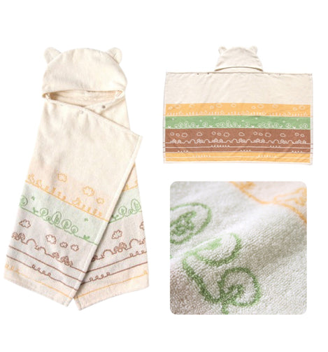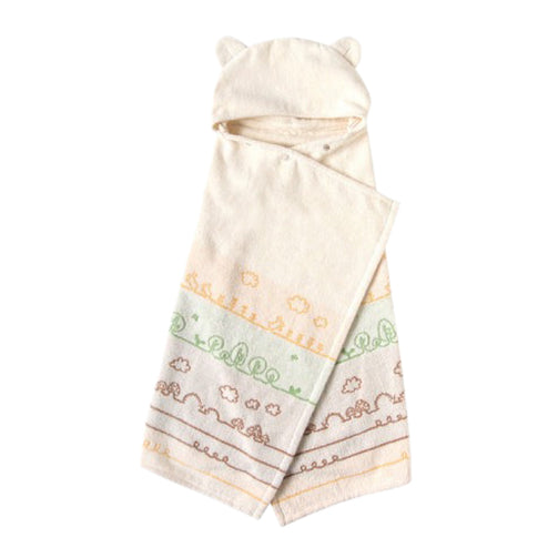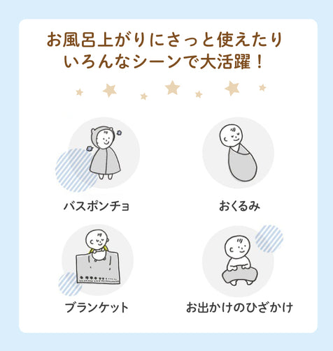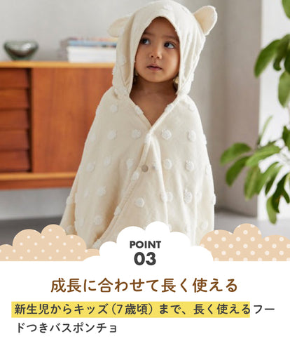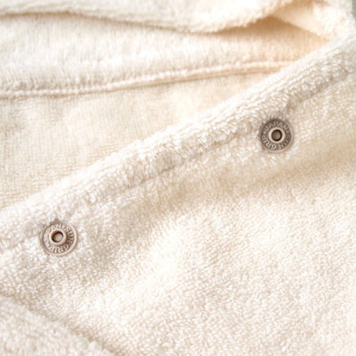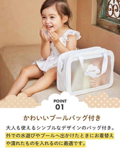 お風呂上がりやおくるみ、お昼寝ブランケットやひざ掛け、 プールタオルと多様なシーンで活躍します。 首元のスナップは2段階で調節可能。0~7歳まで長くお使いいただけます。 外での水遊びやプールへ出かけるときにお着替えや濡れたものを入れるのに最適なプールバッグ付きです。