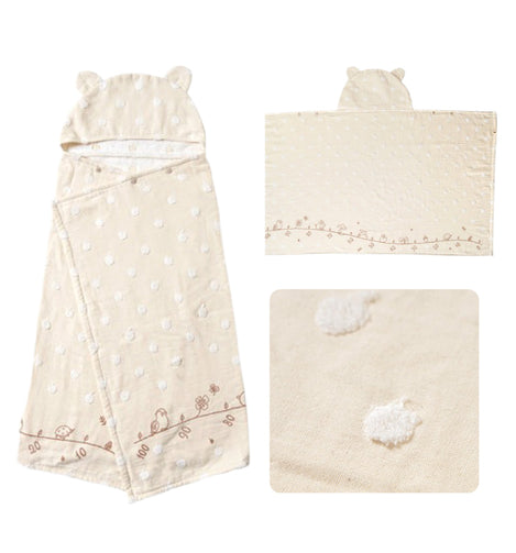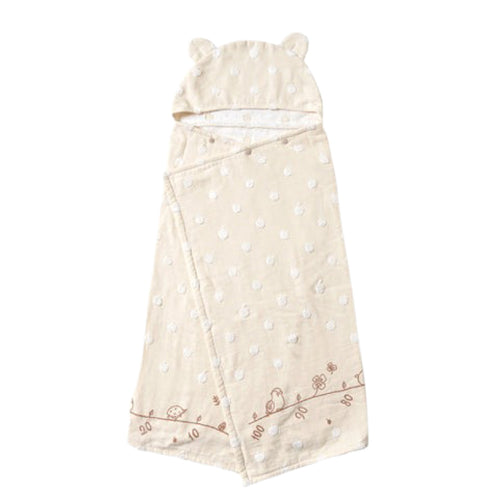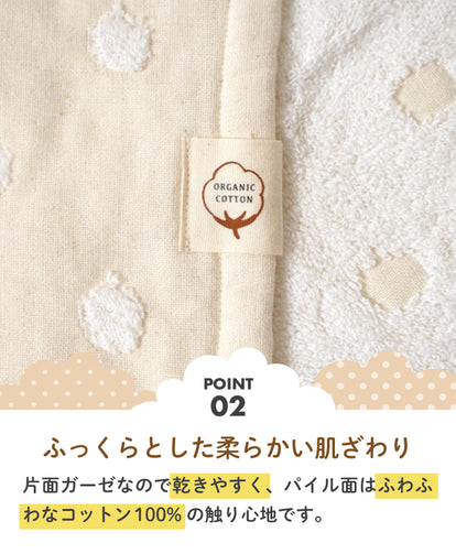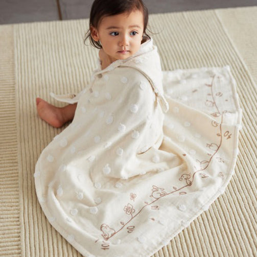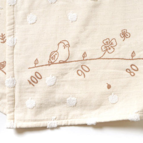赤ちゃんの健やかな成長を願い、幸運のモチーフのフクロウ・クローバー・うさぎ・きのこ・とり・りんご・りす・どんぐり・てんとう虫が描かれています。ナチュラルな生成りのガーゼ地に、オフホワイトのパイルでりんごのモチーフを表現しました。無撚糸パイルのぽこぽことしたテクスチャーが特徴的です。