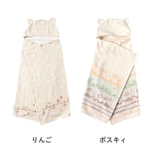 素材 | 〈バスポンチョ りんご〉 コットン100%(パイル部分のみオーガニックコットン) 〈プールバッグ〉 〈バスポンチョ ポスキィ〉 コットン100%(キナリ部分のみオーガニックコットン) PVC(ポリ塩化ビニル) |