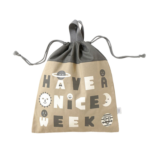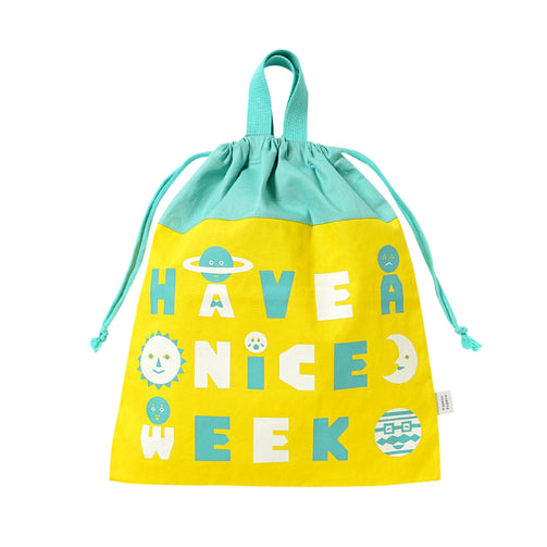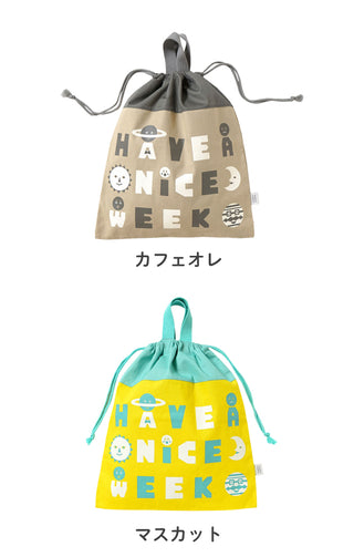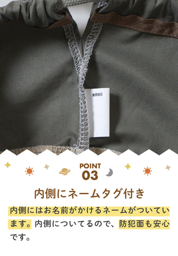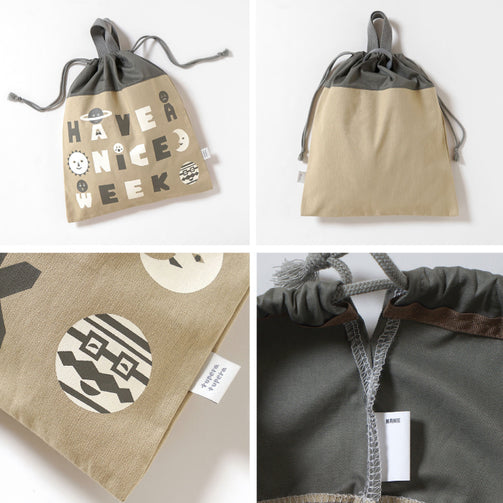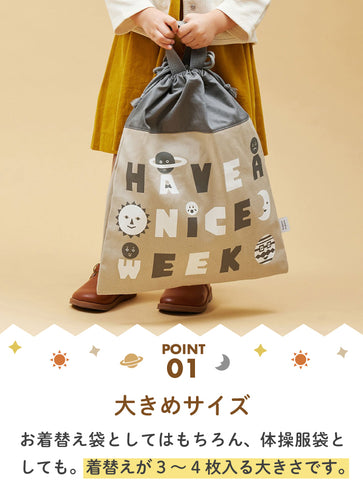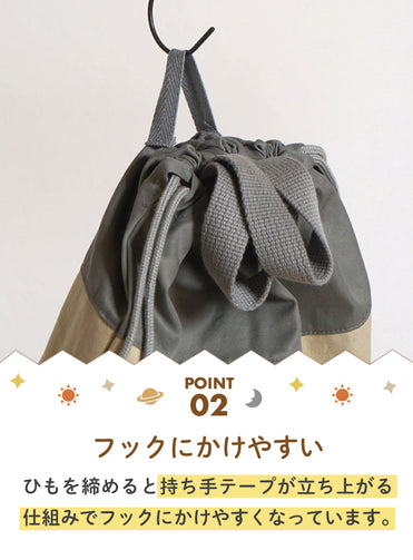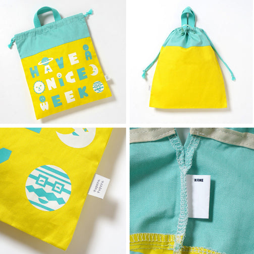 ひもを締めると持ち手テープが立ち上がる仕組みでフックできます。 内側にはお名前が書ける名前があります。 月曜日から日曜日までの7つの曜日をイメージした惑星たちのプリントです。 みんなそれぞれ、笑ったり、泣いたり、怒ったり、いろんな毎日があるけど、みんな違うから面白い。 ワクワクする1週間を!という想いが込められています。