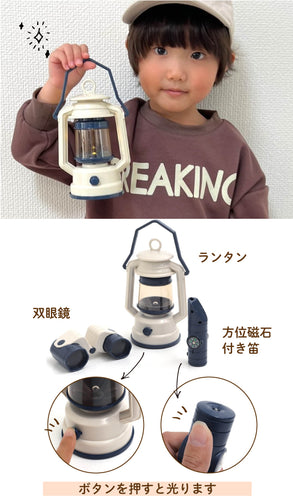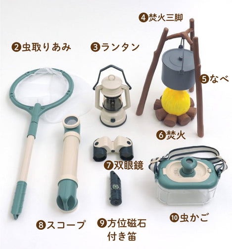 付属品セット | ・折り畳みテント・虫取り網・方位磁石付き笛・双眼鏡・ランタン・スコープ・レンズ付き虫かご・蓋つき鍋・焚火・木×3本・木の結合パーツ ※ランタン 単3×2(別売り)※炭火 単3×3(別売り) ※方位磁石付き笛(電池あり、電池交換不可) |