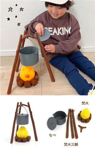 焚火は裏にあるスイッチをONにすると点灯し、パチパチと音が鳴ります。(単三電池3本使用)※別売り ランタンはスイッチを押すとライトが点灯します。 また、焚火三脚は木のパーツを組み合わせることによって鍋をつるすことができます。