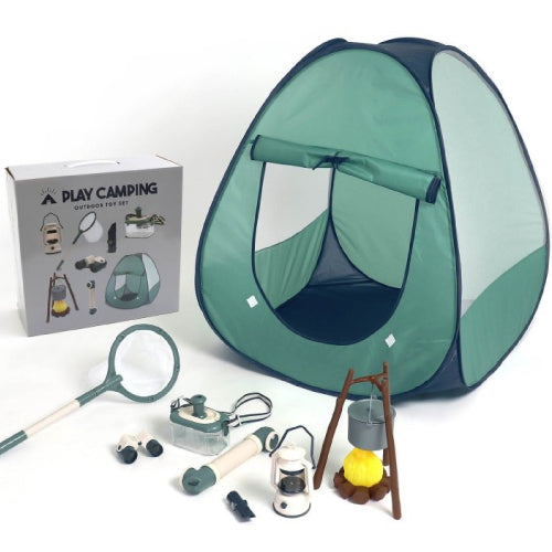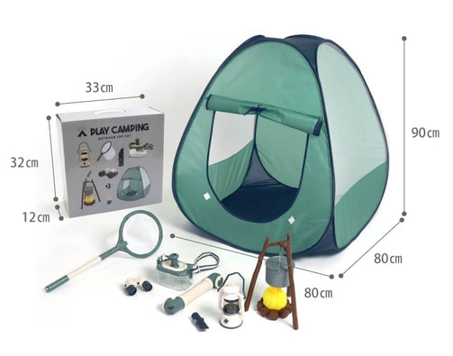 おうちでキャンプでアウトドアが楽しめる!折りたたみのテントやランタン、光と音が楽しめる焚火のおもちゃなど、 おままごとや探検が楽しめる10種類のキャンプグッズが入った豪華なセットです!