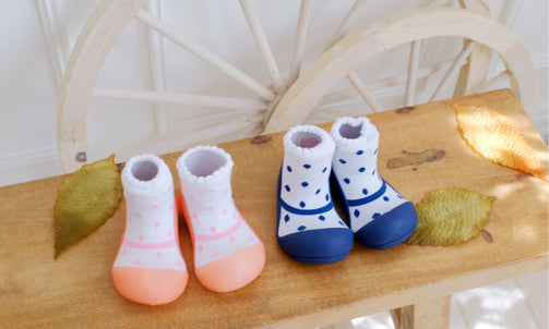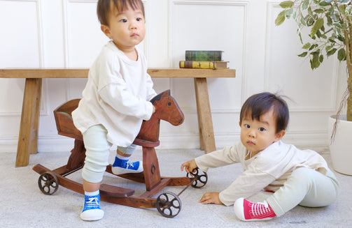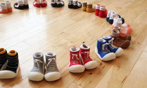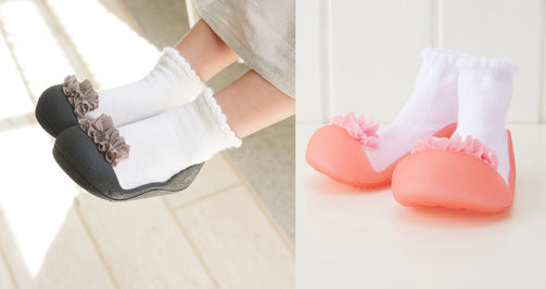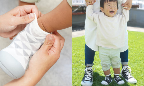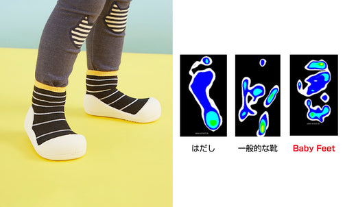 赤ちゃんの足の形や動きを研究して作られた安心設計のベビーフィートは靴下より保護力があって滑らず安全で、靴よりも軽いのでとっても歩きやすい。