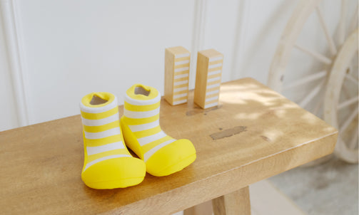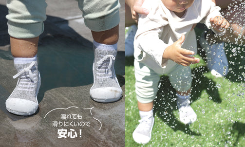 靴底はラバー素材なので濡れても滑りにくく、水辺に遊ぶ時や雨の日でも安心。ベビーカーでのお出かけや、抱っこで少し降ろしてあげたい時など、毎日の子育てに便利です。※防水ではありません。
