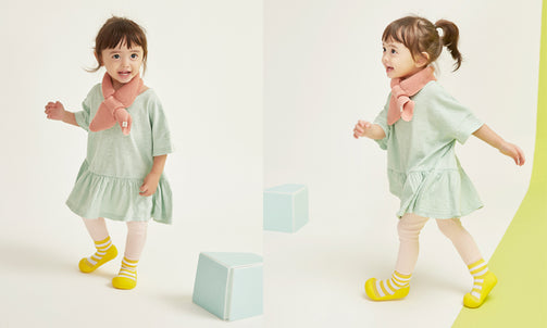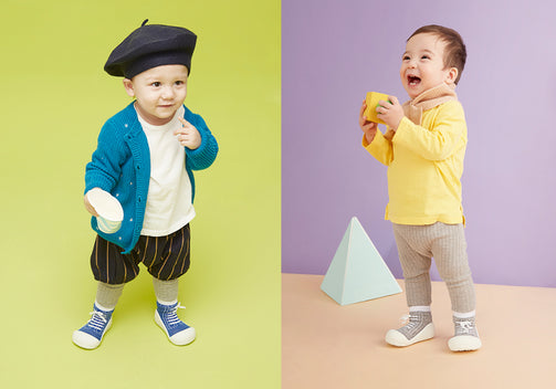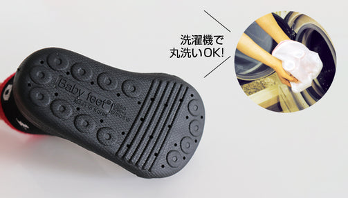 赤ちゃんの足の形や動きを研究して作られた安心設計のベビーフィートは靴下より保護力があって滑らず安全で、靴よりも軽いのでとっても歩きやすい。