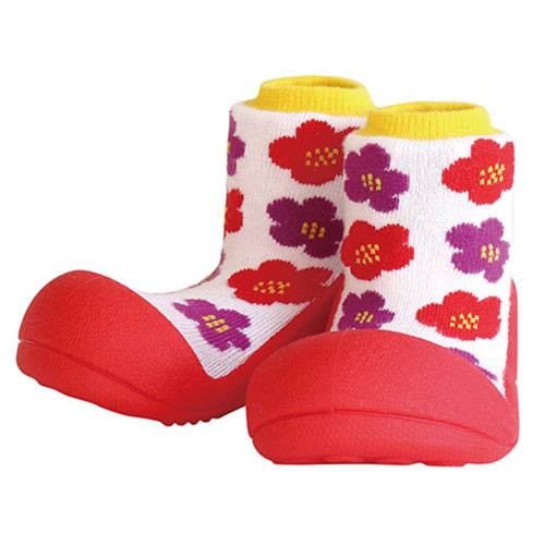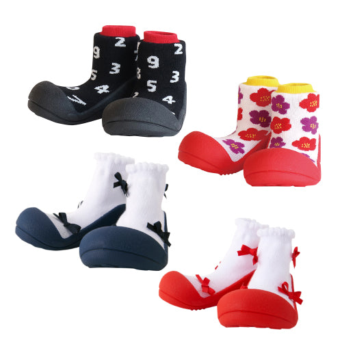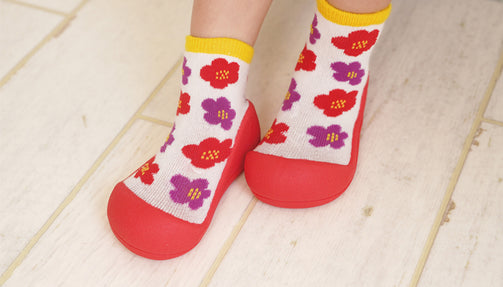 ベビーシューズを履かせると嫌がって脱いでしまう。靴を気にして歩こうとしない。そんな赤ちゃんにぴったりです。主な用途はルームシューズですが底がラバーなので簡易の外履きとしてもご使用頂けます。(底に通気のための穴が空いていますので水気のある場所でのご使用はお控え下さい。)