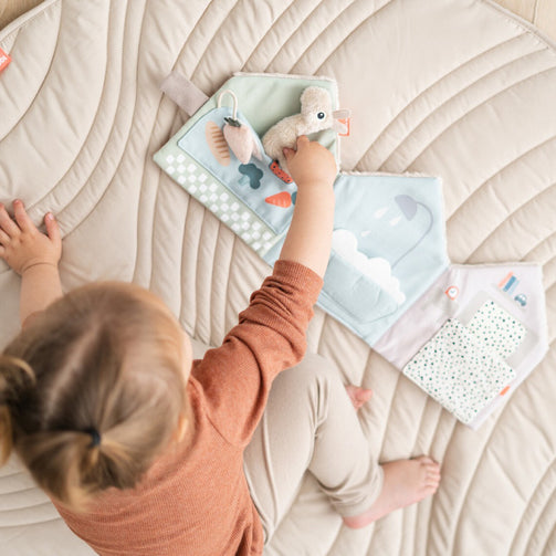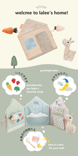 柔らかな色の絵本を広げると、そこはラリーのおうち。 ラリーの人形にご飯をあげたり、おふろに入れてあげて、トントン寝かしつけまで。 ごっこ遊びが楽しいトイです。