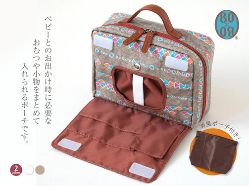ベビーとのお出かけ時に必要なおむつや小物をまとめて入れられるポーチです。 消臭加工(デオドラントネーム(R))を施したポーチつきで、使用済みのおむつを入れるのに最適です。 面テープを外せばすぐにおしりふきやポケットティッシュが取り出せる便利な構造で、マチが5cmあるので、おむつも3〜4枚入ります。 また、持ち手が付いているので、ベビーカーのフックに掛けたり、外出時の持ち運びにとても便利です。 外側の生地にはコーティングを施しているので、汚れてもさっと拭き取れます。