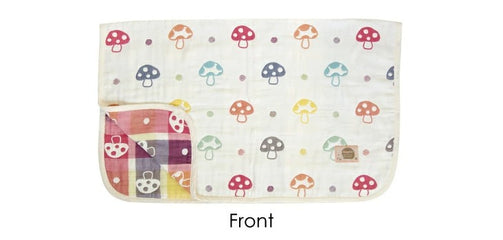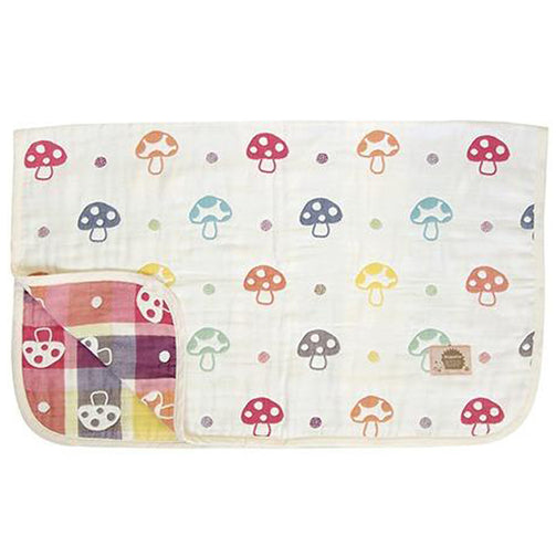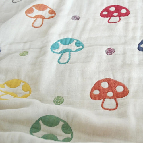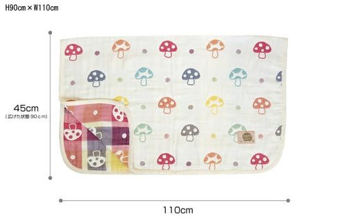 カラフルなきのこのモチーフは裏地もかわいいチェック柄になっており、男の子、女の子を問わず使っていただけます。 夏はさらさら、冬はあったか。1年中使える6重ガーゼは贈り物にもお勧めです。また、洗えば洗うほどふっくらやわらかくなるのもうれしいですね。