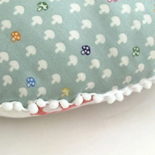 片面は大きなきのこ柄、もう片方は細かいきのこ柄でどちらを表にしても使えます。切り替え部分にポンポンをあしらい、楽しいデザインにしました。