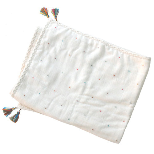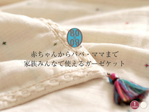 ふわふわの6重ガーゼ生地に6色の糸を織り込み、小さなクロス柄を表現しました。 パイピングテープも柄を織り込んで、オリジナルです。 四隅にはマルチカラーのタッセル付き。 ガーゼ生地は水分を吸収するので、汗かきの赤ちゃんにはぴったりの軽くて優しい素材です。 季節を問わずお使いいただけます。 また、大人用の寝掛けなど、いろいろな使い方ができます。