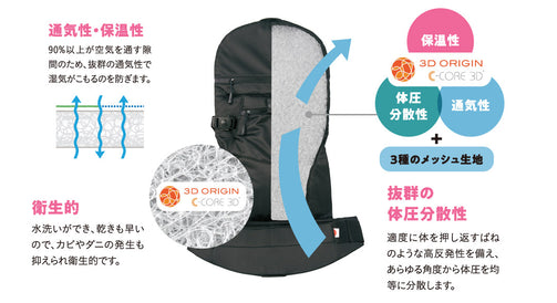 赤ちゃんの背中に当たるクッション材は、フリースファイバーが複雑に絡み合って、立体網状構造の新素材「C-CORE 3D」を使用しています。 高級寝具にも使われ、「保温性」「通気性」がある「体圧分散性」に優れた素材です。