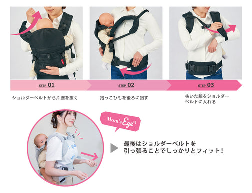対面抱っこの状態からバックルを外しする近く、ラクラク3ステップでおんぶに切り替えができます。ショルダーベルトは引っ張る方向で簡単に長さも調節できます。