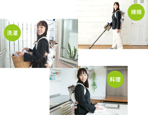 お掃除や洗濯など家事をしながら、赤ちゃんのお世話もしたい。 そんな時に便利なのが『おんぶ』機能。 おんぶが1人でも簡単にできるので、掃除や洗濯など家事の際にも大活躍です。
